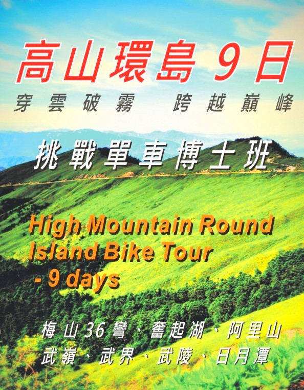 9D1日(星期六):板橋至頭份騎乘95km,總爬升746m,總下降733m。 ●行程:板橋山海戀單車俱樂部→土城→三峽→桃園大溪→石門水庫→龍潭→新竹關西→橫山→竹東→北埔→峨嵋→苗栗頭份。 ●景點:大溪四面佛、石門大壩、北埔老街、北埔地方文化館、峨嵋湖、彌勒佛道院。 ●餐食:早餐/自理午餐/關西美食晚餐/合菜 ●住宿:頭份-豪美旅店或同級 9D2日(星期日):頭份至草屯騎乘105km,總爬升698m,總下降619m。 ●行程:苗栗頭份→竹南→造橋→苗栗市→銅鑼→三義→后里→豐原→潭子→北屯→大里→霧峰→南投草屯。 ●景點:苗栗安瀾宮、舊山線隧道、三義火焰山森林生態教育館、勝興火車站、龍騰斷橋、中社花市花海、大里美芳芋冰城。 ●餐食:早餐/旅館享用午餐/卓蘭或后里美食晚餐/夜市美食 ●住宿:草屯-福美大飯店或同級 9D3日(星期一):草屯至梅山太興騎乘80km,總爬升1118m,總下降477m。 ●行程:南投草屯→南投市→名間→雲林林內→斗六→古坑→嘉義梅山→太平。 ●景點:濁水火車站、古坑綠色隧道、蜜蜂故事館、梅問屋梅子元氣館、梅山36彎景觀公路、望風亭、太平鐵馬驛站。 ●餐食:早餐/旅館享用 午餐/古坑綠隧美食 晚餐/合菜 ●住宿:梅山-太興山莊或同級 9D4日(星期二):太興至阿里山騎乘67km,總爬升2264m,總下降819m。 ●行程:梅山太興→瑞里→太和→奮起湖→石卓→十字路→阿里山。 ●景點:圓潭風景區、瑞里風景區、瑞太古道口、奮起湖火車站、奮起湖老街、四方竹、十字路火車站、阿里山公路。 ●餐食:早餐/旅館享用 午餐/奮起湖便當 晚餐/合菜 ●住宿:阿里山-櫻山大飯店或同級 9D5日(星期三):阿里山至日月潭騎乘115km,總爬升1397m,總下降2572m。 ●行程:阿里山→塔塔加→東埔→和社(同富)→信義→地利→日月潭。 ●景點:鹿林神木、塔塔加遊憩區、夫妻樹、玉山觀景點、新中橫景觀公路、信義農會酒莊、潭南國小、日月潭伊達邵風景區。 ●餐食:早餐/旅館享用 午餐/望高茶園美食 晚餐/合菜 ●住宿:日月潭-青年活動中心或同級 9D6日(星期四):日月潭至霧社騎乘81km,總爬升1884m,總下降1501m。 ●行程:日月潭伊達邵→頭社→向山→水社→孔雀園→武界→曲冰→萬大水庫→霧社。 ●景點:玄光寺、向山遊客中心、世界十大最美自行車道(向山→水社)、水社壩、文武廟、武界水庫、曲冰遺址、萬大水庫、霧社抗日紀念公園。 ●餐食:早餐/旅館享用 午餐/武界小吃 晚餐/合菜 ●住宿:霧社-霧櫻大飯店或同級 9D7日(星期五):霧社至梨山騎乘71km,總爬升2466m,總下降1614m。 ●行程:霧社→清境→翠峰→鳶峰→昆陽→武嶺→大禹嶺→梨山。 ●景點:清境農場、梅峰、翠峰、鳶峰、昆陽、台灣公路最高點3275m武嶺、松雪樓、合歡山景觀公路、大禹嶺、梨山風景區。 ●餐食:早餐/旅館享用 午餐/鳶峰熱食 晚餐/合菜 ●住宿:梨山-好望角飯店或同級 9D8日(星期六):梨山至英仕騎乘80km,總爬升824m,總下降2515m。 ●行程:梨山→環山→思源啞口→南山→四季→棲蘭→英仕。 ●景點:環山部落、思源啞口、南山四季高麗菜園風光、蘭陽溪谷風光。 ●餐食:早餐/旅館享用 午餐/南山自助餐 晚餐/合菜 ●住宿:英仕山莊或同級 9D9日(星期日):英仕至板橋騎乘109km,總爬升1549m,總下降1828m。 ●行程:英仕→明池→四陵、巴陵→羅浮→復興→三民→五寮→三峽→土城→板橋。 ●景點:北橫風光、明池山莊、大漢守衛站、大漢橋、巴陵橋、北橫之星、羅馬公路口、羅浮橋、基國派老教堂。 ●餐食:早餐/旅館享用 午餐/下巴陵合菜 晚餐/自理 ●住宿:6星級溫暖的窩! 活動費用:$29,800元 ★註1:總里程803km,合計總爬升12946m。 ★註2:行程資料僅供參考,以出發前說明會資料為準,行程中亦會依實際情況臨機調整。 ★註3:費用不含各地至出發點來回之交通費用。 ★註4:部分民宿無盥洗用品,請自備。